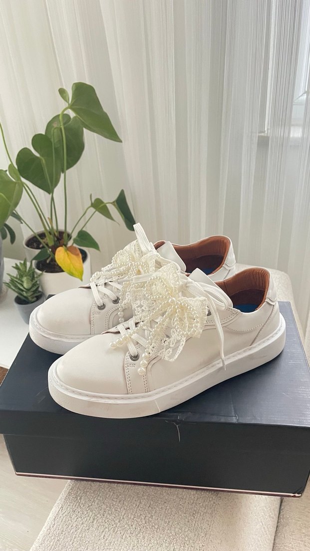 2 kere kullanıldı. Beyaz bağcıklı sneakers, nakışlı dantel detayları ve lastik tabanlı, bohem minimal bir tasarım.