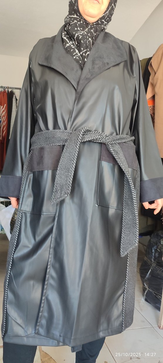 Gevşek kesim, gri uzun büyük beden kaban dokulu kemer ve ceplerle sokak stili için uygun.