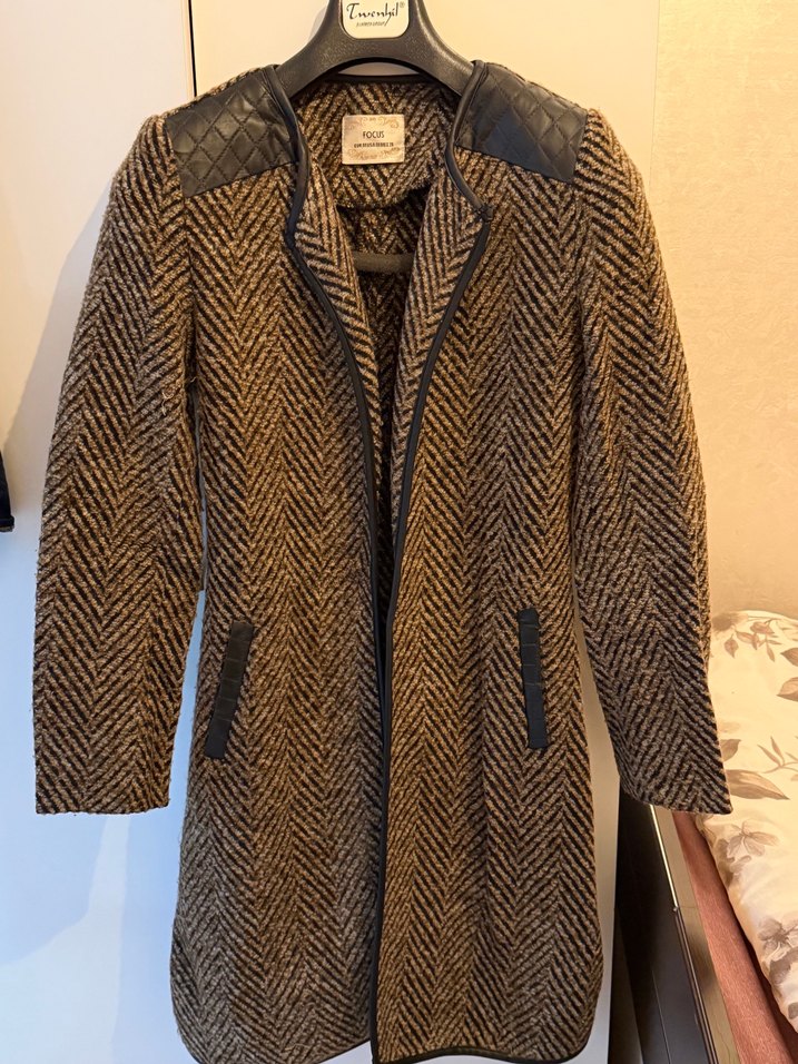 Desenli kumaş ve deri detaylı omuz ve ceplere sahip uzun kaban. Fermuarlı kapanış içerir. defo yoktur