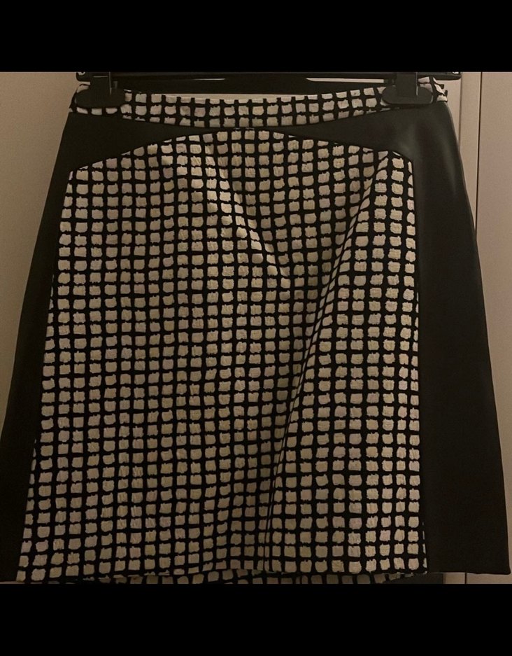 Beyaz kareli desenli, deri detaylı etek.