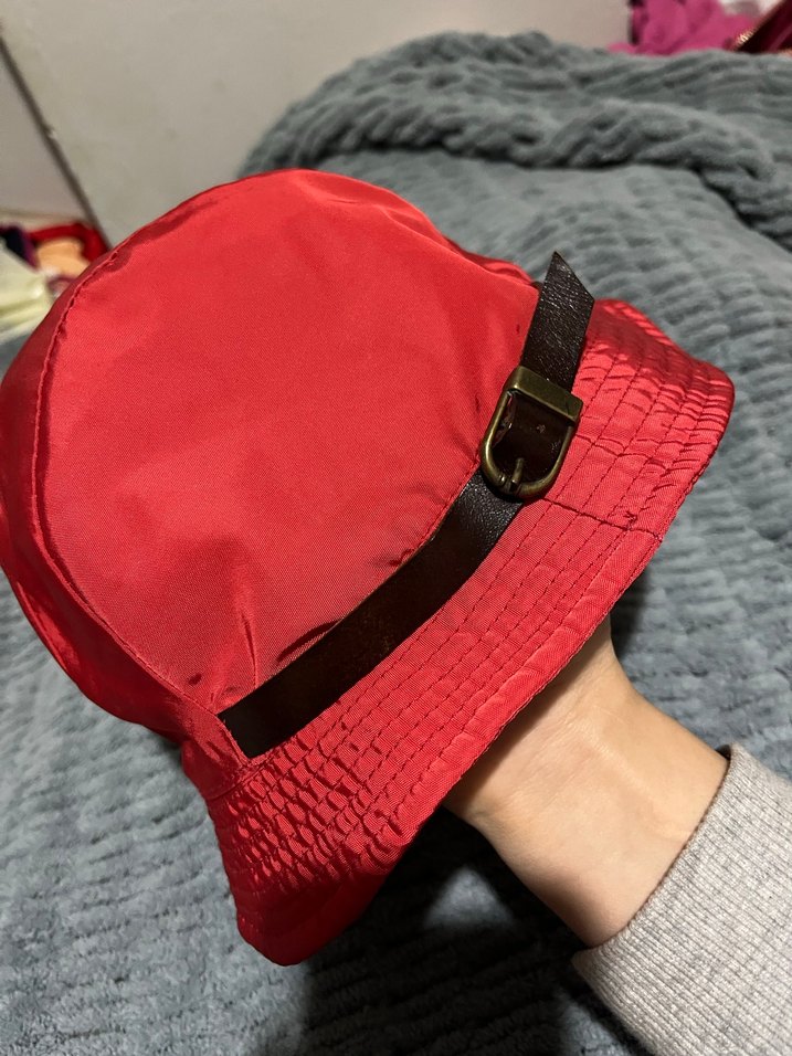 Parlak kırmızı sentetik kumaştan, tokalı kayışlı, eski Parisli karşı kültür tarzını yansıtan kadın şapkası. Deri detaylı grevi marka beymende satılıyor İtalya’da üretildi