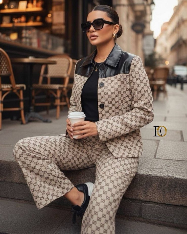 GUCCI • Kumaş: İthal Çift Katlı Kumaş, Deri Detaylı Astarlı Ceket ve Pantolon Takımı • Bedenler: S M L Kahverengi deri detaylı, düğmeli, yılan desenli kadın ceket, ofis kullanımı için uygundur.