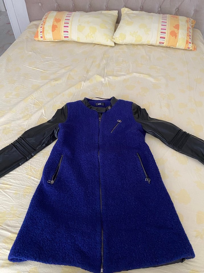 Fitted kesim, koyu mavi uzun boy,deri detaylı kaban Yumuşak ve sıcak kumaş, hiçbir kusuru yok ve şık.