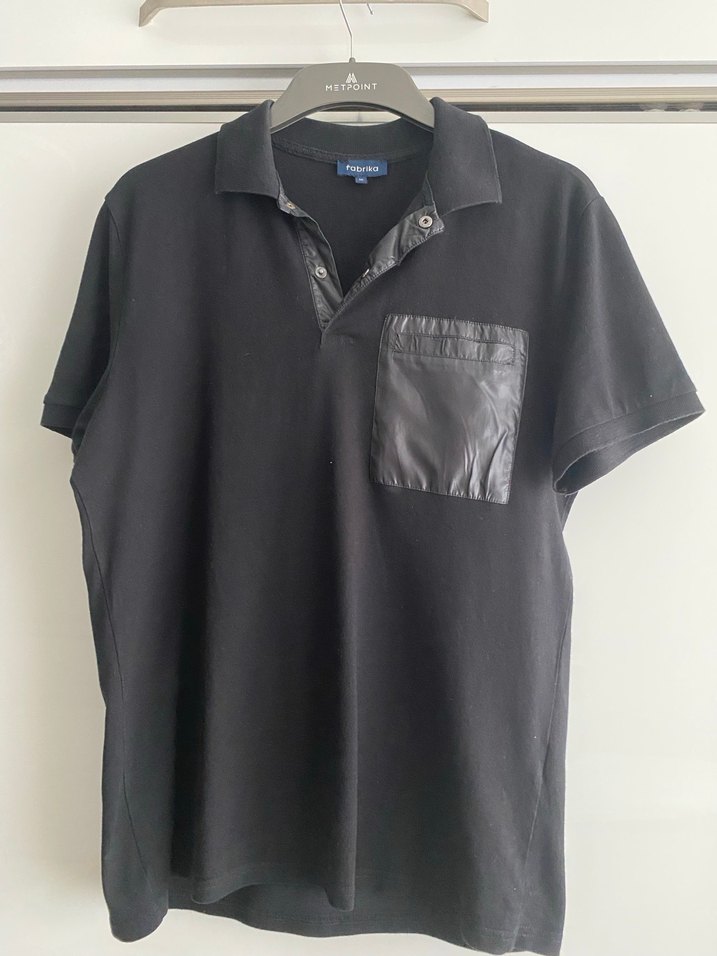Deri cep detaylı, düğmeli, kısa kollu siyah erkek polo tişört.