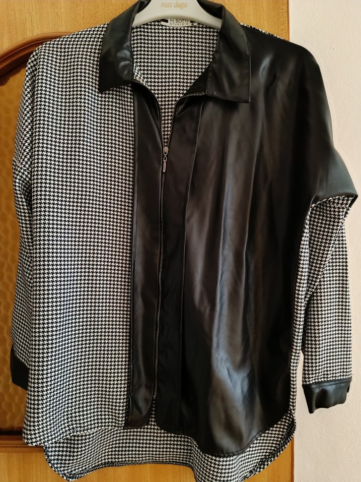 Kadın gömleği, bol kesim, uzun kollu ve yaka detaylıdır. Parlak siyah deri ve siyah beyaz desenli kumaş birleşimi, fermuarlı kapanışlıdır. Günlük rahat kullanıma uygundur.