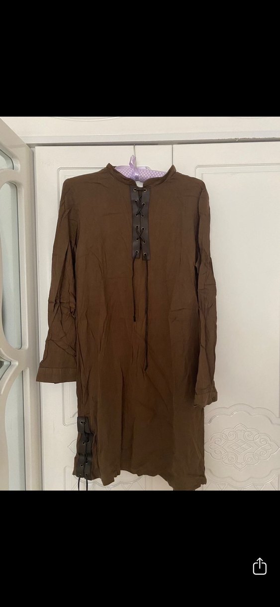 Uzun kahverengi keten tunik, bol kesim, uzun kollu ve halter yaka. Düğmeli detayları ve bohem tarzıyla günlük kullanıma uygundur.