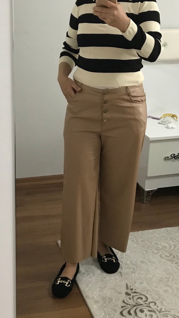 Düğmeli detaylara sahip, midi boy bej deri kadın pantolon. Normal kesim ve sade tasarımıyla günlük kullanıma uygundur.