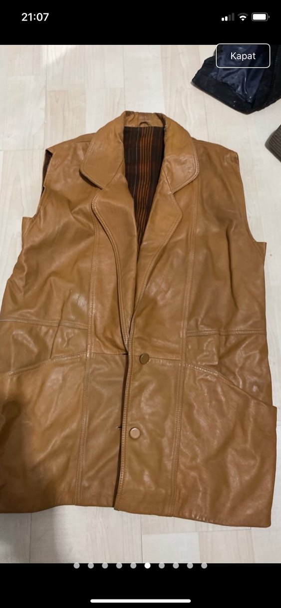 Deri yelek Düğmeli, kolsuz, bej deri ceket. Normal kesim, parlak yüzey ve klasik yaka detaylarına sahiptir. Günlük kullanıma uygundur. Fiyat sorunuz