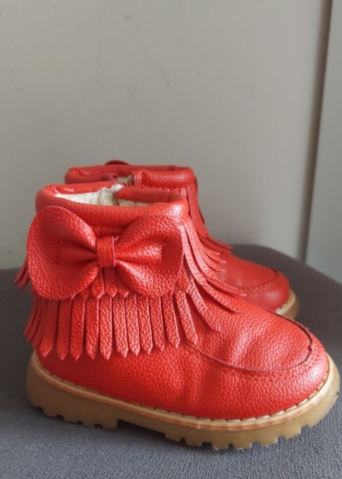 Ürün sadece 2 3 kez giyildi. Hakiki deri el yapımı bot. 21 numara ama 20 21 numara bebeginize kullanabilirsiniz. Sadece kurdelesinin 1 kısmı düşmüş zımba ile tutturdum kırmızı dikiş ipi ile saglamlastirilip kullanılabilir. Alan kişi sıfır ayarında ürün alır. Yeni bebeğine şans getirsin.