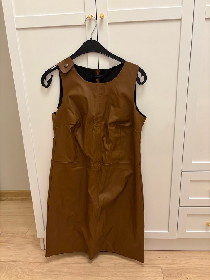 Deri diz boyunda elbise. Trendyol milla markasına ait ölçüleri fotoğrafta yer almaktadır. S bedendir. Rengi taba