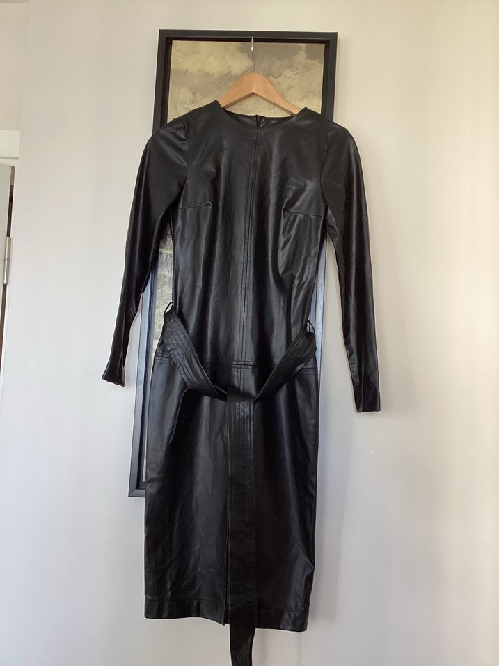 Kuşaklı bel detayıyla şık uzun kollu ve yuvarlak yakalı siyah elbise İki kol arası 41 cm Boy 110 cm Beden 36 /S %100 polyamid AVOMED MARKA Temiz bir üründür küçük geldiğinden satılmaktadır