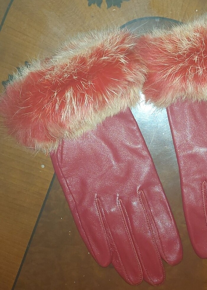 Kirmizi deri ve tavşan kürkü eldiven. Xs-S beden için. Küçük ellere göre