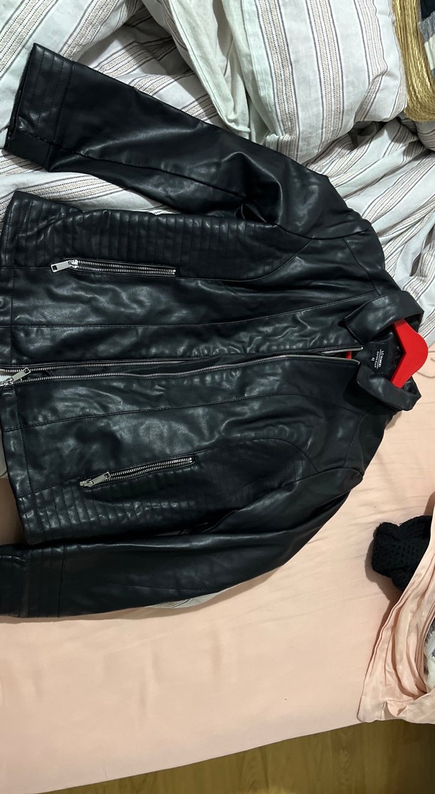 Siyah deri biker ceket, fermuarlı kesimlidir. Notlu yaka ve askılı kolları vardır. Normal midi uzunlukta, günlük kullanıma uygundur.