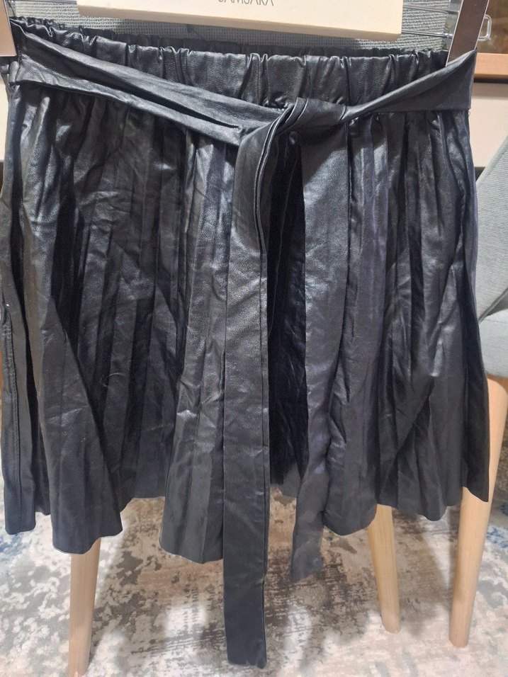 Piliseli tasarıma sahip siyah deri, bol kesim ve bağlamalı kemer detayı ile gotik tarz ve parti için uygun.