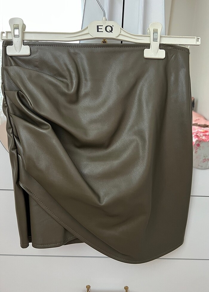 Haki yeşili deri etek sadece bir kez giyildi