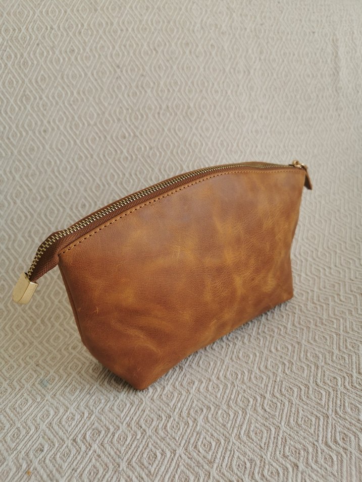 Bej renkli deri makyaj çantası, fermuarlı kapama ve sade bohem tarzıyla günlük kullanıma uygundur. %100 hakiki deridir.