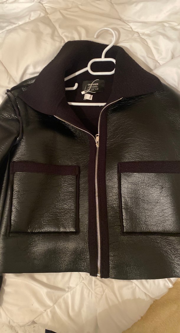 Fermuarlı, siyahlı deri ceket, dar kesim ve notched yaka detayına sahip. Strappy kollu, midi boy ve günlük kullanıma uygun. Etiketi üzerinde birkere denendi