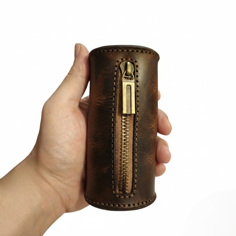 Koyu kahverengi deri cüzdan, fermuarlı kapama ve vintage biker tarzıyla dikkat çeker. Desensiz yüzeyi günlük kullanım için uygundur.