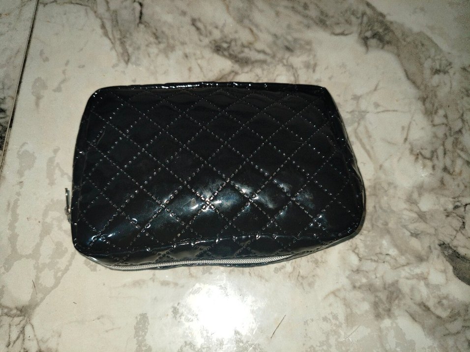 Parlak görünümlü, fermuarlı kapaklı siyah deri makyaj çantası, gotik Paris tarzına uygun koyu renkte.
