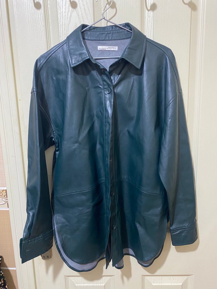 Düğmeli, uzun kollu, mavi deri kadın ceket. Notlu yaka ve bol kesim detaylarıyla günlük kullanıma uygundur.