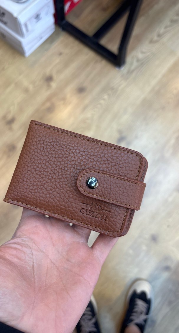 Kahverengi, dokulu deri görünümlü erkek cüzdanı, çıtçıtlı kapaklı ve parlak yüzeylidir. GUZZY logosu kabartma olarak ön yüzündedir.