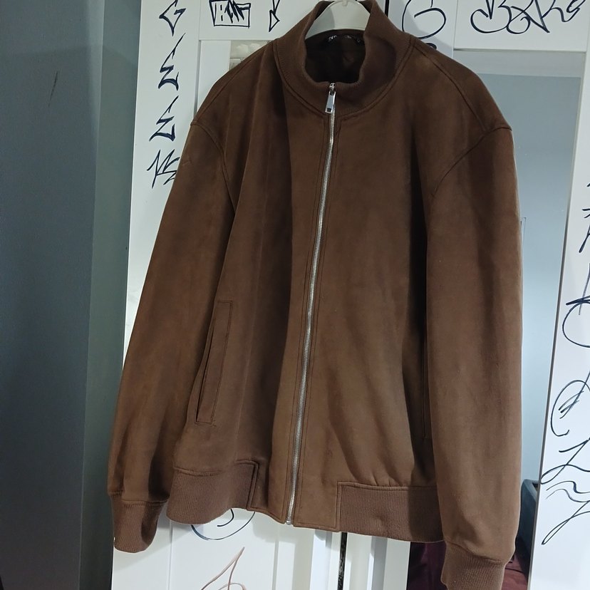 Kahverengi süet görünümlü erkek ceket, yüksek yakalı ve fermuarlı. Bol kesim, uzun kollu ve parlak yüzeyli, sokak stiline uygun. bir iki yerde tiftiklenme olmuş