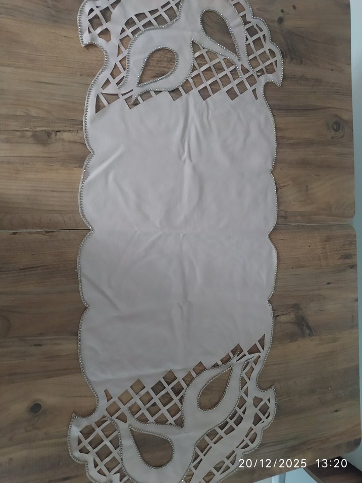 Deri işi. Gri nakışlı beyaz masa örtüsü, geleneksel desenli ve ince işçilikli kesme detaylara sahiptir. El Yapımı.