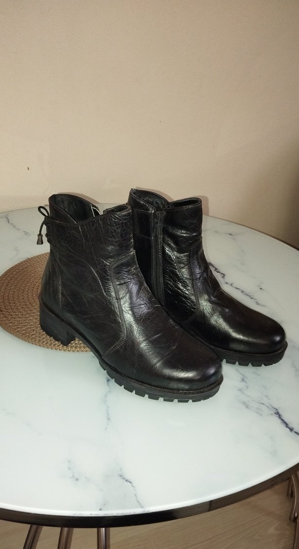 Koyu kahverengi deri kadın botu, blok topukludur. Biker tarzı ve rahatlığı günlük kullanım için sunar. Hakiki Deridir. Hiç kullanılmadı.