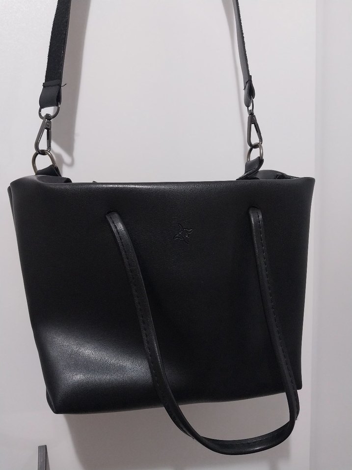 Siyah deri, minimal tasarımlı, tokalı askılı, desensiz kadın çantasıdır. Günlük kullanıma uygundur.