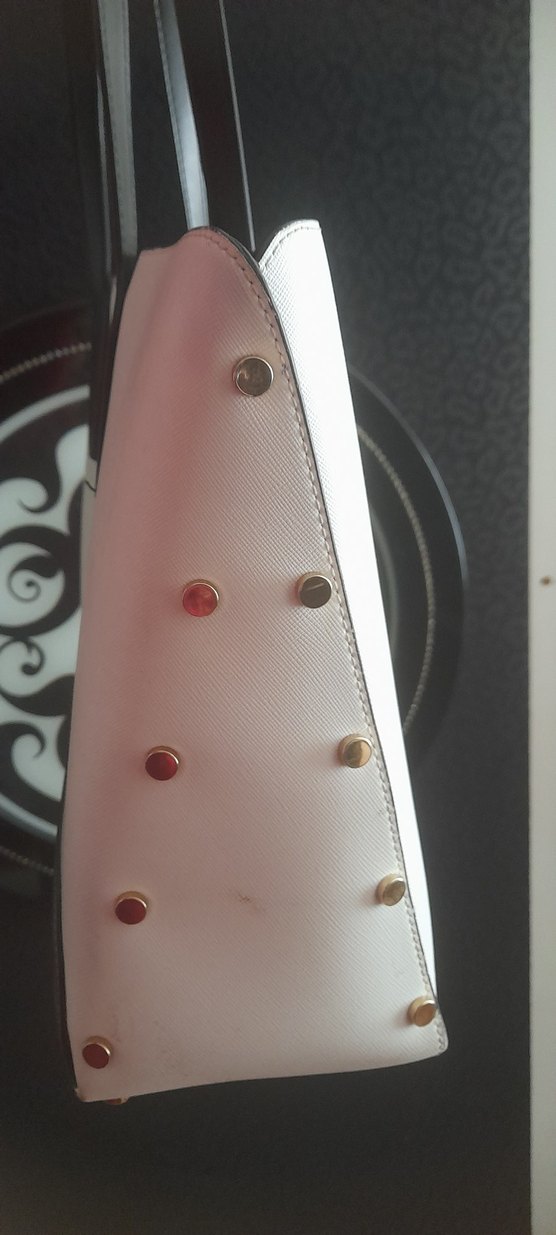 Beyaz deri kadın çanta, parlak ve düğmeli detaylarıyla, çağdaş avangart tarzda günlük kullanım için uygun.