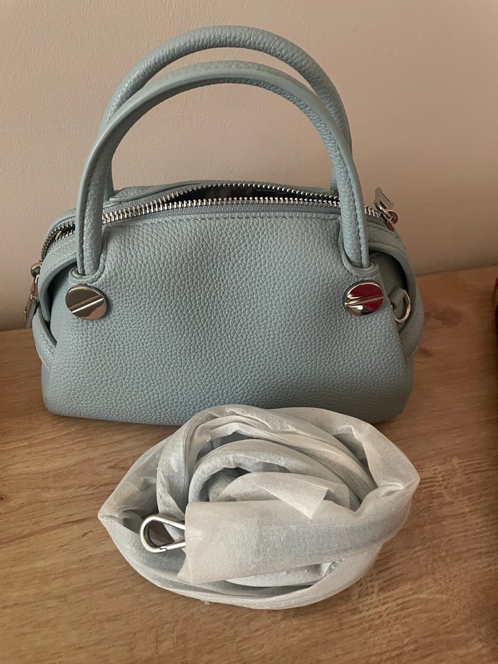 Mavi deri kadın çanta, tokalı detaylara sahip, minimalist ve çağdaş tarzda, günlük kullanıma uygun. Kulplu ve ekstra askılıdır.