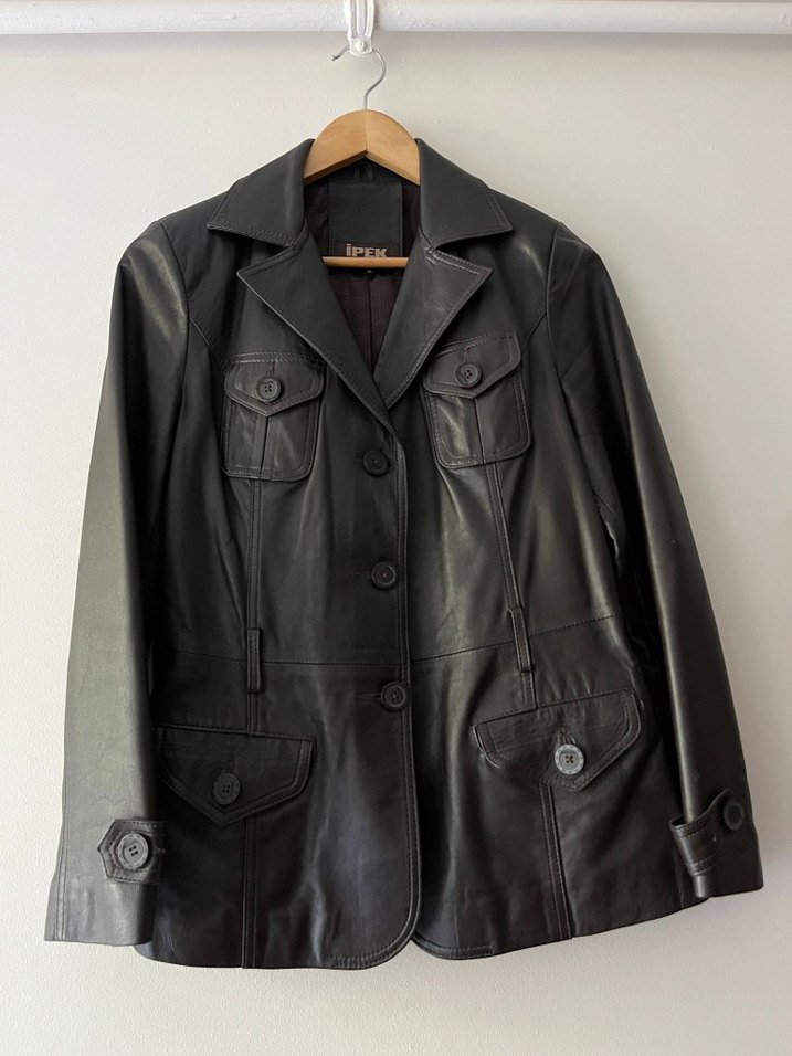 deri kadın ceket, düğmeli ve kırma yakalıdır. Uzun kollu, normal kesim ve midi boydadır. Ofis için uygun klasik goth tarzında. marka temsili gerçek deri