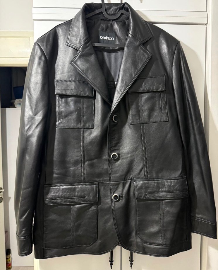 Siyah deri kadın ceket, düğmeli ve keskin yaka detaylıdır. Uzun kollu, normal kesim ve klasik tarzıyla hem ofis hem sokak giyimine uygundur. Çoklu cepleriyle kullanışlıdır.