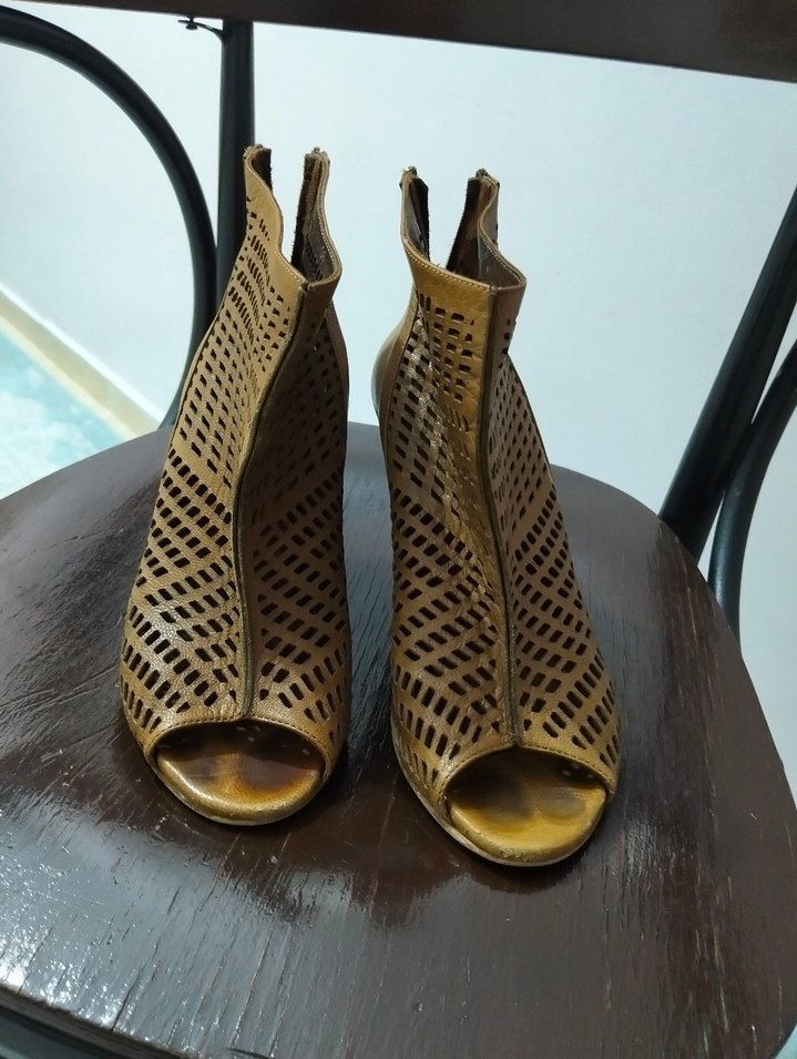 Parlak yılan desenli kahverengi deri dolgu topuklu kadın sandalet, deri çok rahat kibar bi ayakkabı.