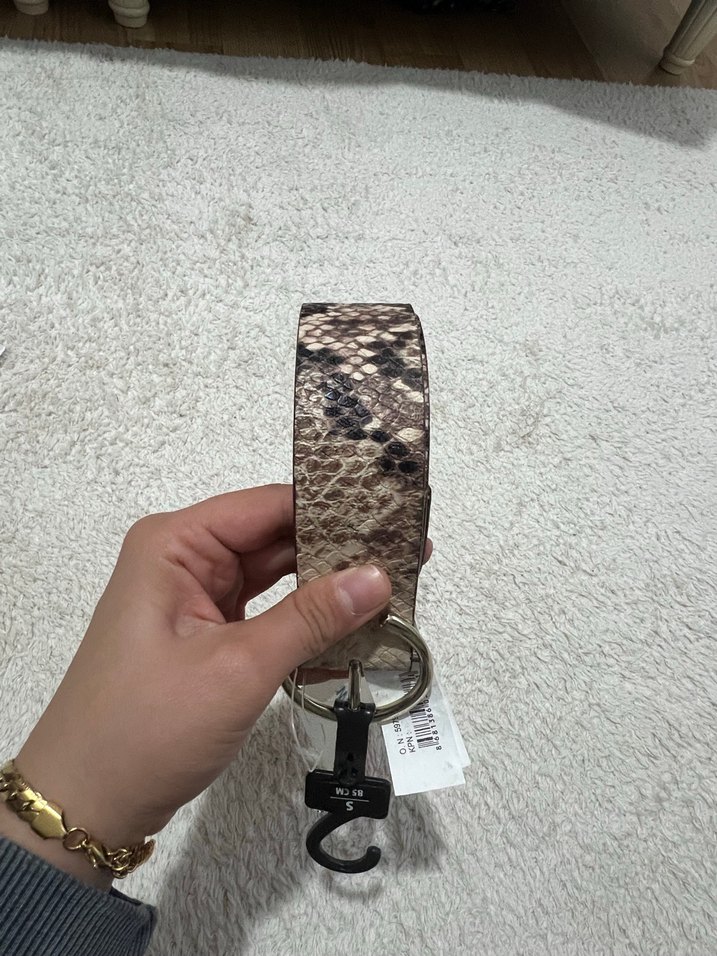 Kahverengi deri kadın kemer, desenli dokusu ve yuvarlak metal tokasıyla günlük sokak stiline uygun.