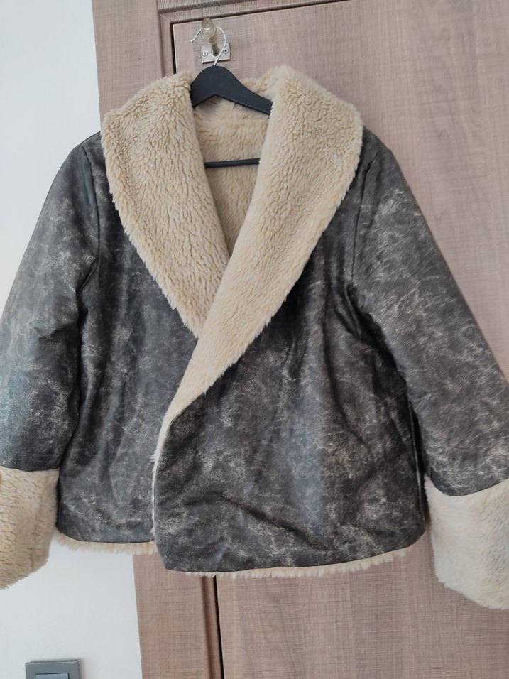 Deri malzemeden, kürk detaylı yakalı ve manşetli, bol kesim kısa kadın ceket. Uzun kollu, günlük kullanıma uygun 40 beden uzunluk boyu 55 santim yeni