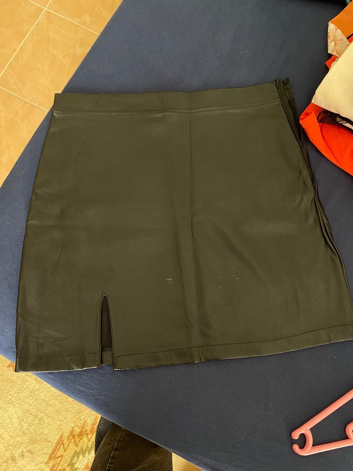 küçük ön yırtmaçlı, dar kesim suni deri midi etek, sokak stili için uygundur.