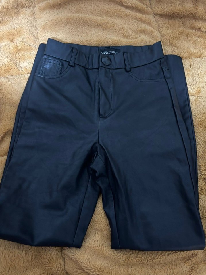 siyah deri, normal boy, dar kesim kadın pantolon. Tokalı detaylı, gündelik rahat normcore tarzında.
