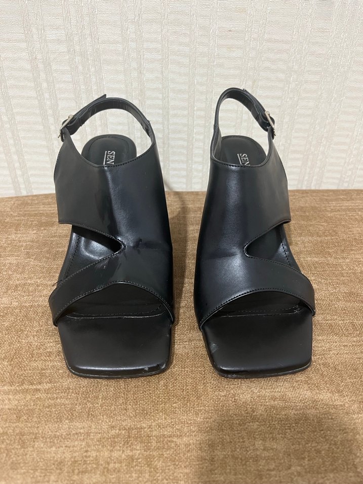 Blok topuklu kadın topuklu ayakkabı. Minimalist ve gotik tarzda, ofis kullanımı için uygun, kauçuk malzemeden yapılmıştır.