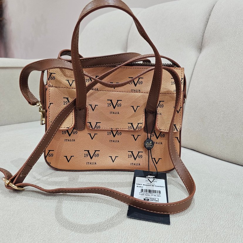 Parlak kahverengi deri çanta, baskılı vintage desene ve fermuarlı kapanışa sahip, günlük sokak stili için uygun.