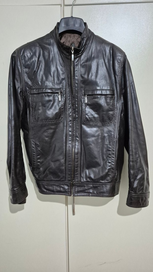Kahverengi deri biker ceket, çıtçıtlı yakalı ve fermuarlı ceplerle. Uzun kollu ve normal kesim, günlük sokak stili için uygun.