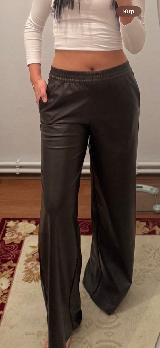 Siyah deri görünümlü, bol kesim midi boy kadın pantolon. Belde kemer detayıyla ofis için uygun, desen içermeyen rahat bir tasarım.