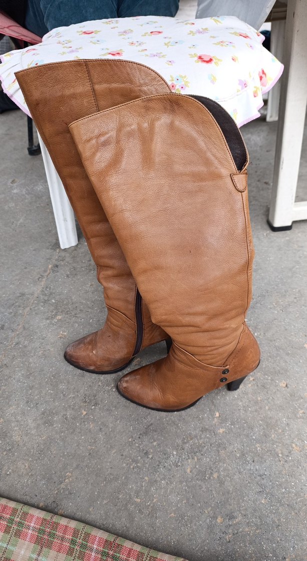 Kahverengi deri çizme, stiletto topuk ve tokalı detaylarla, trend sokak stiline uygun. içi kürklü. Gerçek deri olup boya ister. O yüzden fiyatı uygun tutuyorum.