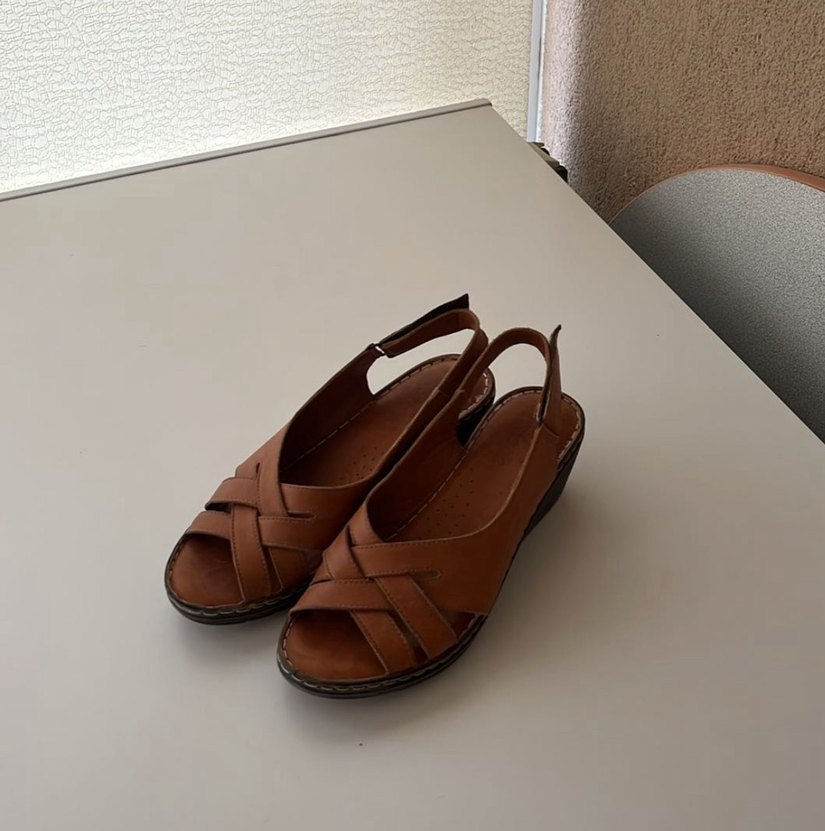 Kahverengi deri kadın sandalet, dolgu topuklu ve sade tokalı tasarıma sahip, günlük kullanıma uygun.
