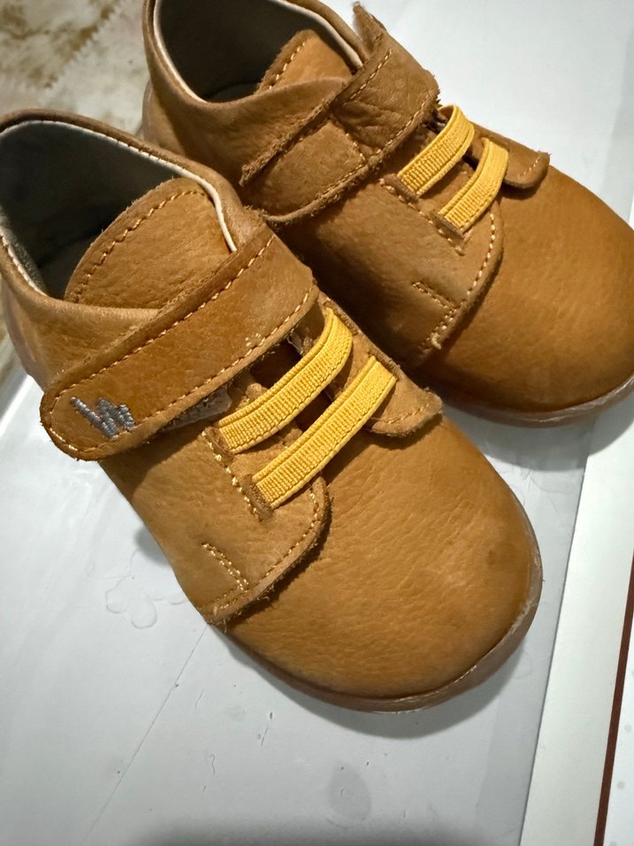 Kahverengi deri, süet deri görünümlü, cırtlı, ortopedik desen içermeyen erkek bebek ilk adım ayakkabısı. Sokak tarzına uygun.