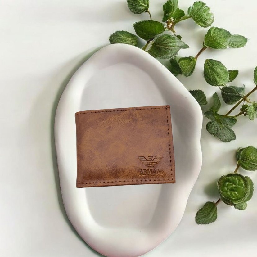 Kahverengi erkek cüzdanı, parlak yüzeye ve önünde Armani logosuna sahiptir. Minimalist, streetwear tarzında baskılı desen etkisi bulunur.