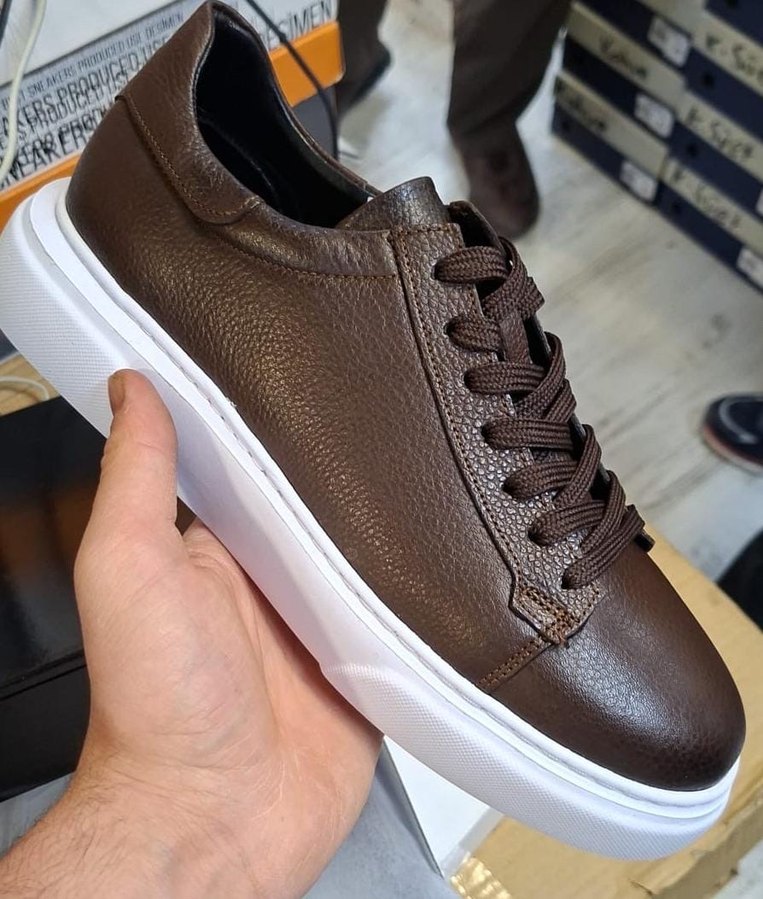 Deri kahverengi erkek spor ayakkabısı, bağcıklı ve beyaz tabanlı, günlük sokak stiline uygun.