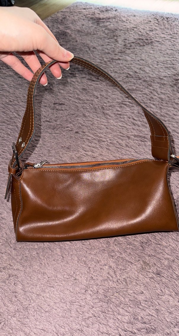Kahverengi deri çanta, fermuarlı kapanışa sahip ve minimalist tasarımlıdır. Günlük sokak stili için uygun, sade ve basic yapıda.
