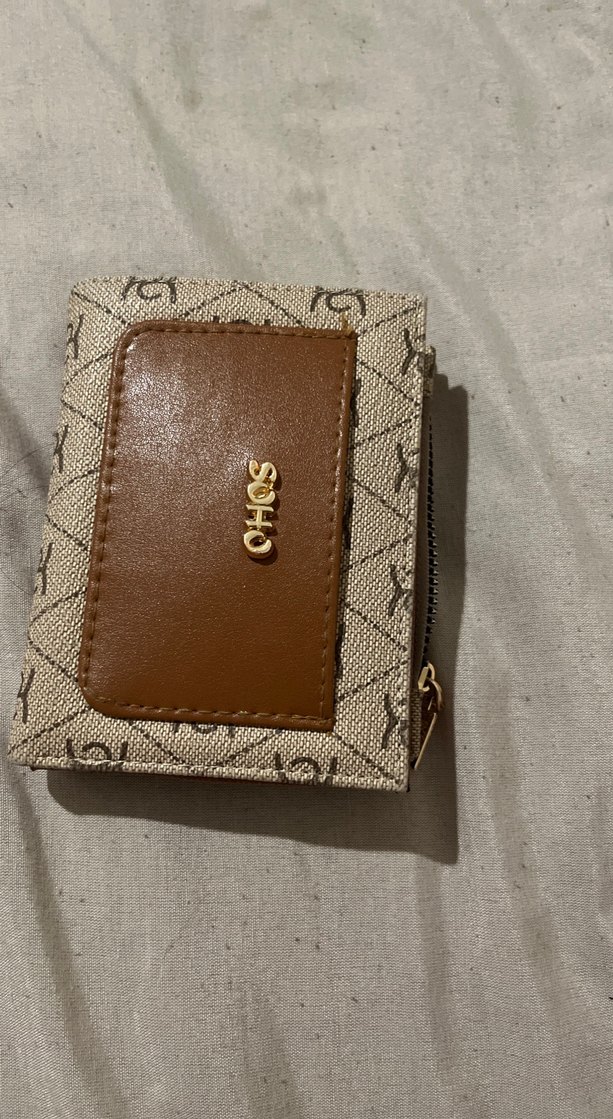 Kahverengi deri, fermuarlı kadın cüzdanı. Baskılı deseni ve parlak yüzeyi ile Paris sokak modasını yansıtan SOHO logosu bulunur.