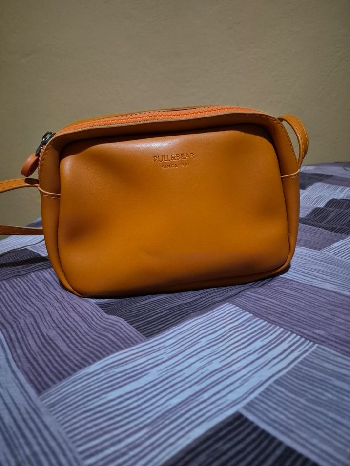 Minimalist tasarımlı, tokalı kahverengi deri kadın çapraz çanta. Pastel tonlarıyla sokak stiline uygun, desen içermeyen şık bir model.